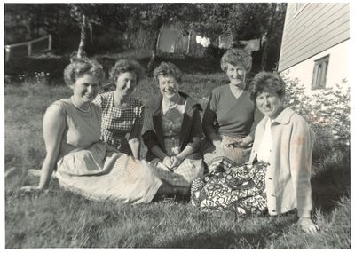 Skipstømmermann Hilbert Hansen, tømmermann Hilmar, kjøkkensjef Ella og matros Arnold Karlsen, arbeider Arthur Kristiansen, arbeider Anton Olufsen, diskedame Solveig Seljelv, (1946).