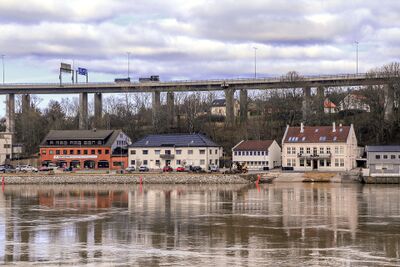 Pæddekummen sett fra Alvimveien. Vi ser bebyggelsen i Strandgata i Sarpsborg med Sandesund bru i bakgrunnen.