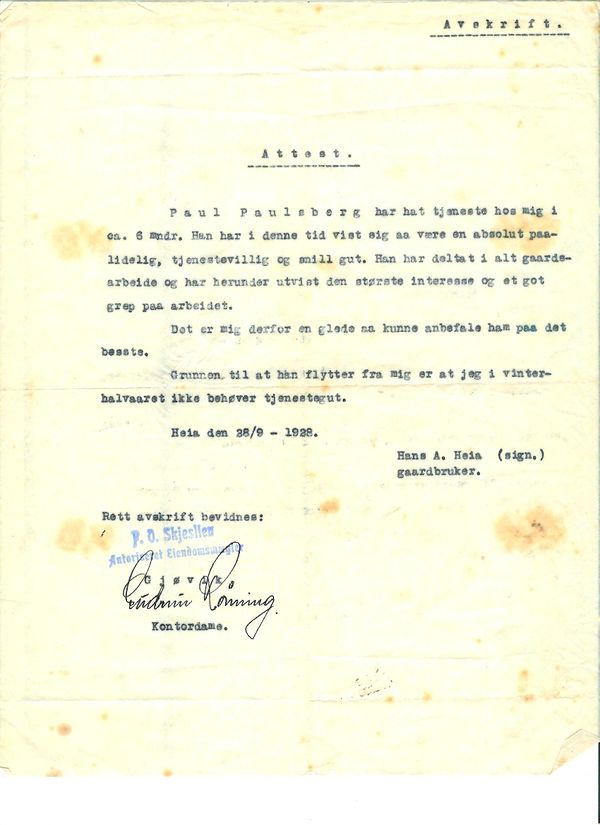 Paul Paulsbergs attester fra ulike gårds- og gartnerjobber på Østlandet 1928-1931, blant annet i Asker, Bærum og Eidsberg. Dette er jobber han hadde før han giftet seg og kjøpte bruket Paulsberg ved Gjøvik.