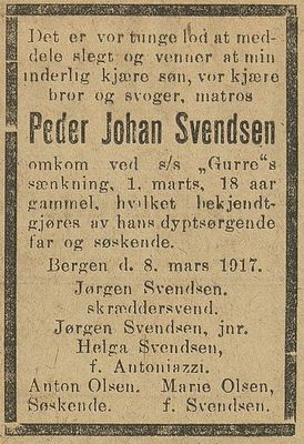 - Dødsannonse i Bergens Tidende 8. mars 1917.