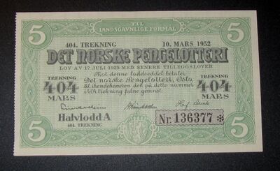 Halvlodd til 5 kroner til Pengelotteriets trekning 10. mars 1952 (trekning nr. 404).