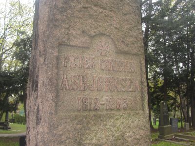 Asbjørnsen er gravlagt på Vår Frelsers gravlund i Oslo. Gravminnet har form av en høy bauta.