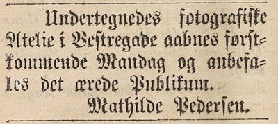 Hun er i folketellinga 1875 oppført som ugift fotograf, bosatt i Vestre gate i Grimstad sammen med mora Stine Marie Pedersen f. Olsen (f. 1821) og en eldre bror.