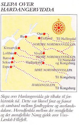 Om våren ble hester og storfe kjøpt opp på Vestlandet og ført opp på Hardangervidda, hvor de gikk på beite om sommeren mens de ble passet på av gjetergutter. Om høsten ble dyrene drevet ned til byene på Østlandet, og et viktig marked fantes i Kongsberg fra 10. september. Denne driftehandelen så vel som handel med andre varer, var viktig for forsyningene inn til Kongsberg. Sporene etter disse driftene kan være synlige på vidda, og navnet Nordmannsslepene er et kjent navn på stiene. Bildet viser lokaliseringen av slepene over Hardangervidda. Søndre Nordmansslepet fulgte vestsiden av Numedalen mot Kongsberg. Etter gjennomsnittsforbruket av kjøtt ifølge boken til Broch, skulle befolkningen på Kongsberg forbruke 170 000 kg kjøtt om året. Samkultgruppen har anslått vekten på kyr til 80 kg, og det tilsvarer at befolkningen på Kongsberg trengte vel 2 000 kyr. Det ble derfor et anselig antall kyr som ble drevet frem langs slepene bare til Kongsberg alene.