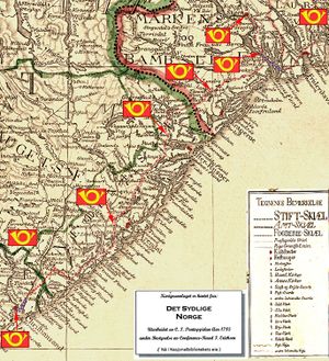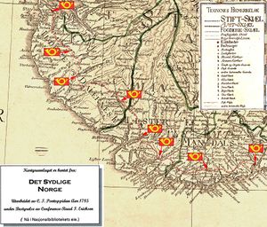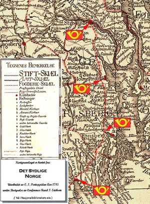 På vedlagte kopi av Pontoppidans kart fra 1785 har samkultgruppen avmerket postveien og med posthorn vist steder som kommenteres frem til Christiansand.