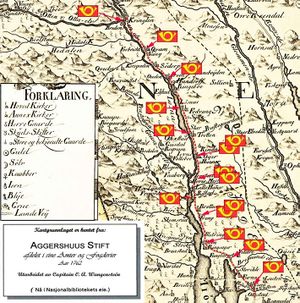 - Alle disse her anførte gaarder paa Dofre, skifter til efter omgang, at føre Christiania Post ofver fieldet til Riise i Oppdalen som er 8 Miile, og Trudhiembs Posten fører til Rommengaard paa Sæl = 2 1/4 Mil.