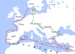 - Den første vinteren ute oppholdt nordmennene seg i England. Derfra gikk ferden til det kristne Galicia (Nord-Spania) og videre langs den mauriskkontrollerte vestkysten av Den iberiske halvøy, gjennom Gibraltarstredet (sagaenes Norvasund) og inn i Middelhavet.
