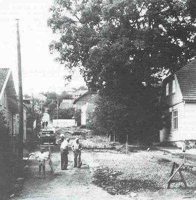 Prestegata sett fra Storgata. Bildet viser utvidelsen av gata ca. 1950. Til høyre ser vi deler av Hallings hus.