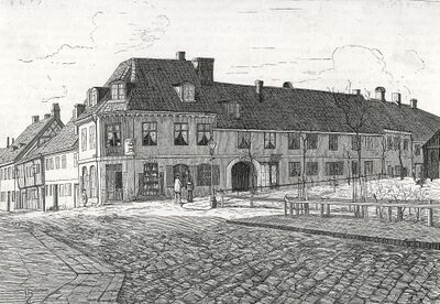 Prinsens gate 26, «Brevikgaarden» før den ble revet i 1880 til fordelt for Schiøllgården, xylografi av Hans Christian Olsen