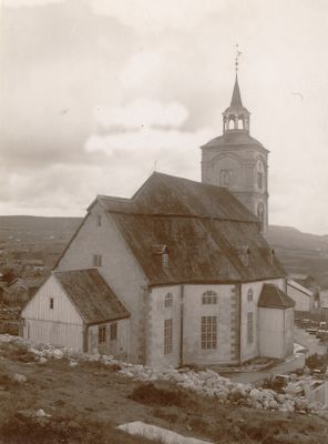 Gamlekirken ble stående til nykirken var ferdig, for så å bli revet. I koret henger et bilde av gamlekirken.