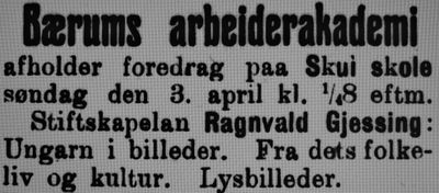 Faksimile fra Asker og Bærums Budstikke 30. mars 1910: Annonse for lysbildeforedrag om Ungarn på Skui skole av Ragnvald Gjessing.