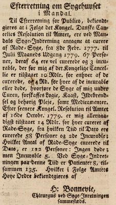 Det ble oppretta lasaretter for ratesykepasienter mange steder i landet. Her en rapport som behandling av ratesyke i Mandal. Fra Christiansandske Uge-blade, 3. mai 1781.