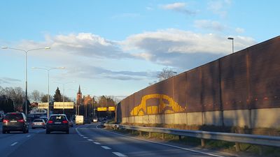 Kunstverket er plassert på en støyskjerm på en lang og slak strekning. Kunstverket er utformet i treverk, aluminium og skiltrefleks og forestiller en bil. Bilen er svært langstrakt, 32 meter, og sett rett mot støyskjermen er det en rekke med enkeltstående vertikale staver på ca. 2,5 meters høyde med en halv meters mellomrom. Den kjørende ser kunstverket i en spiss vinkel og oppfatter derfor bildet av bilen.