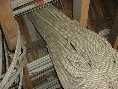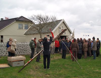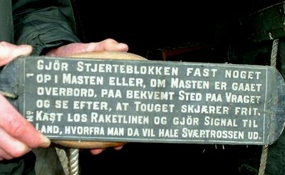 Så tar Thore oss med ut i redningsbua. Her får vi se raketter og utskytningsstativ, og en demonstrasjon på hvordan utskytningslina legges opp på et brett med styrepinner, slik at det ikke skal komme kink på lina. Vi får prøve redningsstolen utført i solid seilduk. Det moderne redningsgeværet med en tynnere utskytingsline, skiller seg fra det øvrige utstyret ved at det er lett og hendig i bruk. Fra taket henger svære kveiler med grovt tauverk. Og ellers er her kasse på kasse med utstyr som fortsatt står klare til å lesse på kjerrer, ........