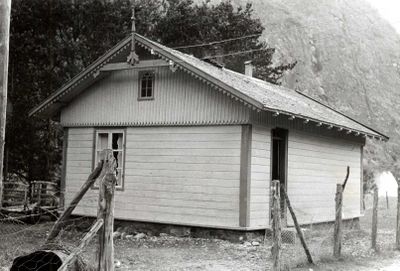 Rikheim, Lærdal, Sogn og Fjordane, bygd 1869. Lite kvitt skulehus med møreke kantar og fjell i bakgrunnen. Registrering utført 1958-59 av Johan Sciong for Noregs Lærarlag.