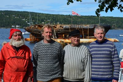 Jan Wanggaard (grå genser) og Bjørn Myrann, Stig Pettersen og Terje Mørkved er teamet som sto bak prosjektet Maud returns home. Maud ble slept fra Cambridge Bay i Canada til Norge med slepebåten Tandberg Polar og lekteren Jensen. Her Wanggaard og de andre i gruppa gått i land ved Roald Amundsens hjem 19. august 2018, Maud ses i bakgrunnen.