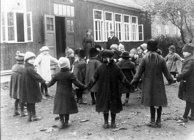 Sandaker friluftsskole, ca. 1920. Barn som leker foran skolebygningen. I bakgrunnen Carl Schiøtz og skolens bestyrer Helga Kjerulf.