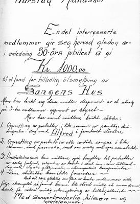 Med andre ord: Harstad Mandskor var det mannskoret i Norge som først fikk eget hus! Eller også kan man si at Harstad Mandskor fikk sitt hus flere år før at Sørumsand Sangforenings hus ble realisert.