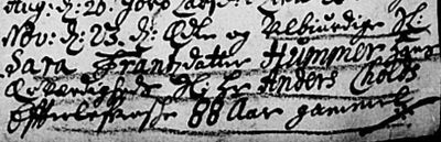 Sara Frantzdatter Hummers gravferd i ministerialboka for Øyer, 23. november 1703: «grl. den ædle og Velbiurdige Sl. Sara Frantzdatter Hummer Hans Ærværdigheds Sl. Hr. Anders Cholds Efterleverske 88 aar gl.».