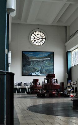 Innvendig er vegg og tak kvitmåla, og søylene som held traverskrana har fått ein mørk sjøgrøn farge. Armatur og utstyr går i dei same fargane. Golvet i maskinsalen og monteringshallen er lagt med lyse fliser, medan overgangen mellom vegg og golv er markert med mørke fliser.