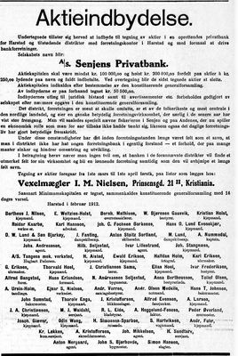 - «Undertegnede tillater sig herved at indbyde til tegning av aktier i en opprettendes privatbank for Harstad og tilstødende distrikter med forretningskontor i Harstad og med formaal at drive bankforretninger. Selskabets navn blir: A/S Senjens Privatbank».