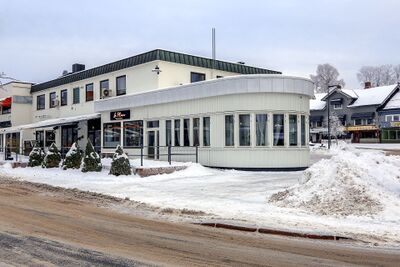 Parti fra starten av Silovegen på Årnes. Den avrundede delen i forgrunnen er fra 1930-årene og var opprinnelig bensinstasjon.