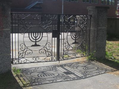 Syvarmet lysestake som symbol på port ved Helsfyr gravlund i Oslo (den jødiske delen av Østre gravlund)