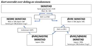 I 1853 ble Søndre Skinstad (matrikkelnummer 390) delt i to deler[25], 390a og 390b). 390a, som i dag er Søndre Skinstad bygsles av Anders Nilsen Tollefsrud, mens 390b bygsles av Mathias Hansen. 390b ble seinere (i 1875) innlemma i Nedre Skinstad (bnr. 1).