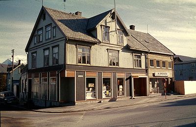 Skippergata 27 i Tromsø var en flott beliggende hjørnegård ved Fridtjof Nansens plass. I dag har den biltrafikken til Tromsøbrua som nærmeste nabo. - Gammelt matrikkelnr. 144b.