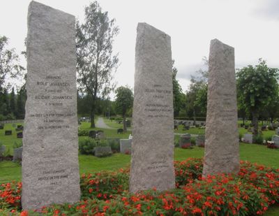 Tre høye minnebautaer over lokale falne fra andre verdenskrig er et iøynefallende trekk ved Skoger kirkegård.