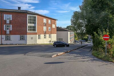Skoleveien sett fra Kirkeveien. Nærmest ser vi Ski ungdomsskole.