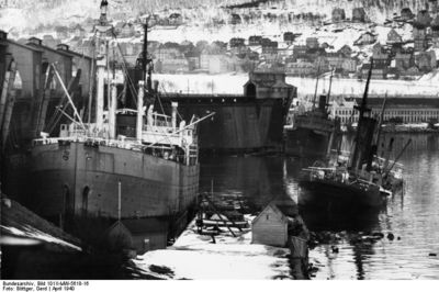 - Narvik havn 10. april 1940.Foto: Lindbäck-Larsen, Odd: 6.Divisjon, 1946