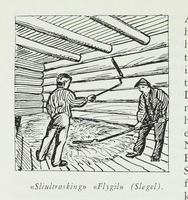 Ein la kornbanda på golvet i fleire rekkjer med aksendane mot kvarandre. Så slo ein med sloga så kornet vart skild frå halmen, raka bort halmen og kasta kornet med ei låvekluft, ein gaffelforma reiskap. Etterpå kunne ein tresk kornet meir varsamt ein gong til for å få ut agner og småhalm.