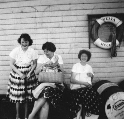 Frå venstre Marit Andreassen, Solfrid Karlsen og Annemor Mongstad på Holmekaien en søndag i 1960 før dei skal reisa til Bergen på arbeid.