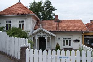Stoltenberggården i Storgata 26[7] er fra 1700-tallet. Huset har to etasjer med valmtak. Det har navn etter handelsslekten Stoltenberg; gården kalles også Woldegården, men dette navnet forbeholdes nå nabogården mot nord. Postkontoret lå i Stoltenberggården fra omkring 1970 til begynnelsen av 1980-årene. Før 1970 hadde Kafé Neptun lokaler der; en ny kafé med samme navn har senere blitt åpnet i Thornegården. Bygningen er fredet.