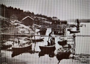 Foto fra 1920; Johan Larsens brygge i Sør-Son. Sikkerheten var ikke akkurat satt i høysetet. Foto: Anders Beer Wilse.