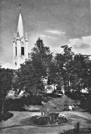 Den andre av Steinkjers kirker 1902-1940. Steinkjers første kirke brant ned under Sørsiabrannen 15. august 1900. Den andre kirka ble reist på murene etter den første og innviet 21. desember 1902. Parken rundt kirka som vi ser deler av på dette bildet ble også ødelagt da byen ble bombet 21. april 1940. Der de to benkene sto ble det seinere bygd ei brakke som Frelsesarmeen fikk overta - «Frelsesarmebrakka»