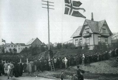 | 27 | Murer Iver Pedersen bygde huset i 1907. Adolf Hansen skal også ha vært eier. Los Halvor Halvorsen kjøpte huset, men solgte det til familien Agnar Ellingsen (formann i kommunen), etter at huset deres nede ved Haukebø og Pedersen-verkstedet i Fjordgata ble revet da KMV utvidet på sørsiden av dokkområdet på 1960-tallet.