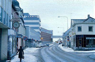 Storgata sett sørover i 1974. Nr. 28 ligger på hjørnet til høyre. Det nye Storgata 25 har fortrengt alle trehusene på venstre side.