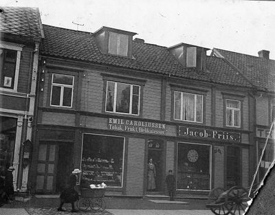 Emil Caroliussen etablerte i 1915 sin kolonialforretning med frukt, delikatesser og skipsproviant. Flyttet i 1918 til Storgata 57.