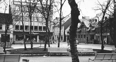 Enken Gusta Kvaal startet sin lille Kvaals tobakksforretning mot Kirkegaten i 1919. I 1930-årene ble den overtatt av sønnen Oddvar og han var her helt til bygget brant ned i 1953. En kort tid fikk man da tilhold i nabogården til Nicolay Norbye før forretningen flyttet til Sjøgata 35. (1984)