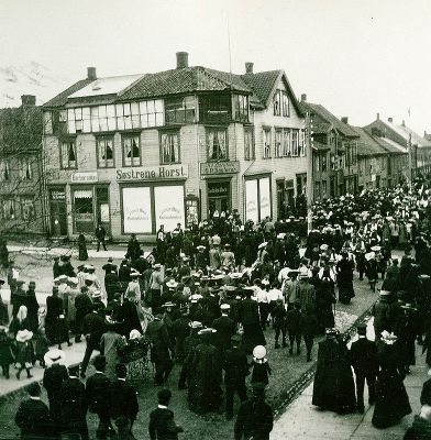 I 1916: Fotograf Th. Wennberg - Tromsø cigar- og tobaksmagasin, disp. Olaf, Alf og Gusta Jensine Kvaal - Anna Elida Knudsen, broderiforretning, (åpnet ca. 1900), sydame Aagot Emilie Johansen.