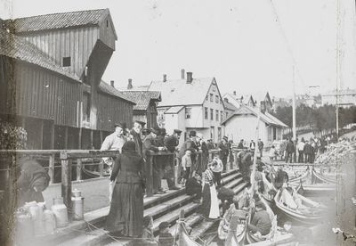 Folkeliv i torghuken rundt år. 1900. Wadelbrygga til venstre.