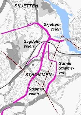 Den eldste delen av veisystemet i Strømmen består av fire veier. Gamle Strømsvei var en viktig ferdselsåre inn mot Lørenskog og hovedstaden, slik den hadde ligget der helt siden 1200-tallet. Dette er den eldste veien gjennom Strømmen. Skjettenveien eller Skjettenbakken hører også til de eldste traseer. Dette var veien fra Gisledal – dagens Sagdalen – forbi Skjetten gård og videre forbi Stav. På vestsiden av Sagelva var det Sagdalsveien som etter hvert ble hovedåren. Strømsveien ble anlagt i 1910 -11 på jomfruelig grunn på Sagelvas østside, på tvers av ravinene ned fra den bestående Gamle Strømsvei.