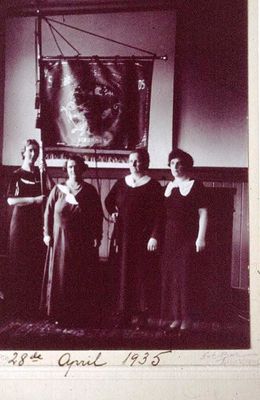 Sagdalen skoles guttemusikk mødreforening ved faneavdukningen 1935. Fru Kværne, fru Smeby, fru Bakken og fru Theodorsen.