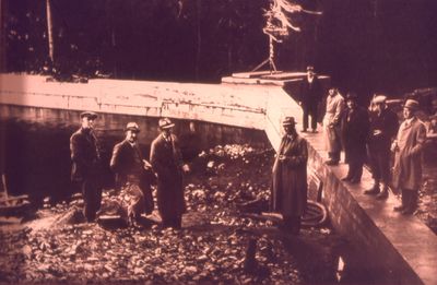 Åmotdammen 1908. Inspeksjon og kranseskål for ny demning for vannverket.