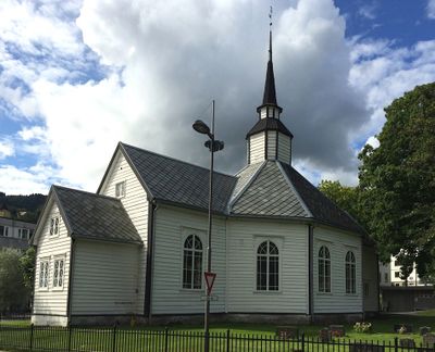 Tidligare låg det ei stavkyrkje på staden. Men eit stort fjellskred i 1731 på den andre sida av fjorden skapte ei flodbølge som øydela kyrkja. Ei alterplate og ein alterskåp frå omlag 1500-talet er bevart. Plata er i marmor og har relikviegjømme, mens skåpen har motiv med Madonna, St. Laurentius og St. Andreas.