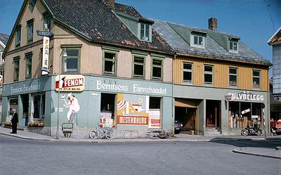 Etter krigen flyttet Sigv. Berntsens fargehandel hit. Fargehandel, malervarer, tapeter, parfyme, vaskeartikler, (Arne Berntsen), (1957/77), Gulvbelegg A/S, (disponent Jørgen Berntsen), (1957/77). Hans A. Hansen, agentforretning, (1957).