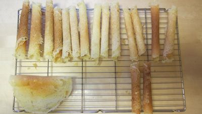 • Stek løvtynne strull av en god spiseskje røre i krumkakejernet.