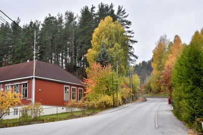 Sykehusveien sett vestover. Til venstre, Professor Tronstads gate 10, opprinnelig Tinnesmoen barneskole, siden Notodden husmorskole, og nå Røde kors.
